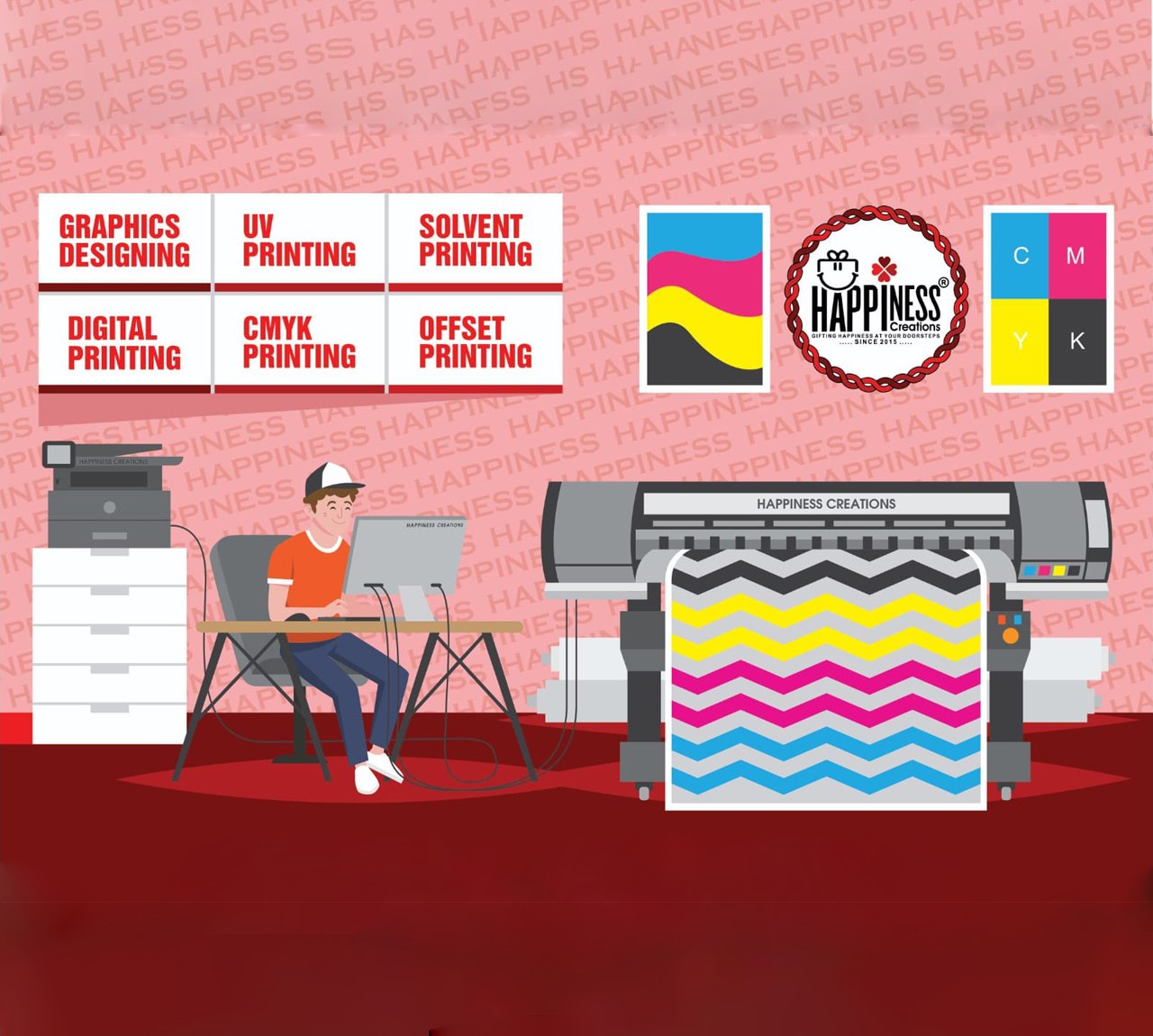 At Happiness Creations, we specialize in a wide range of printing and designing services, including Graphics Designing, UV Printing, Solvent Printing, Digital Printing, CMYK Printing, and Offset Printing. Whether you need striking marketing materials, eye-catching displays, or custom creative prints, we ensure top-notch results with attention to detail and vibrant quality.